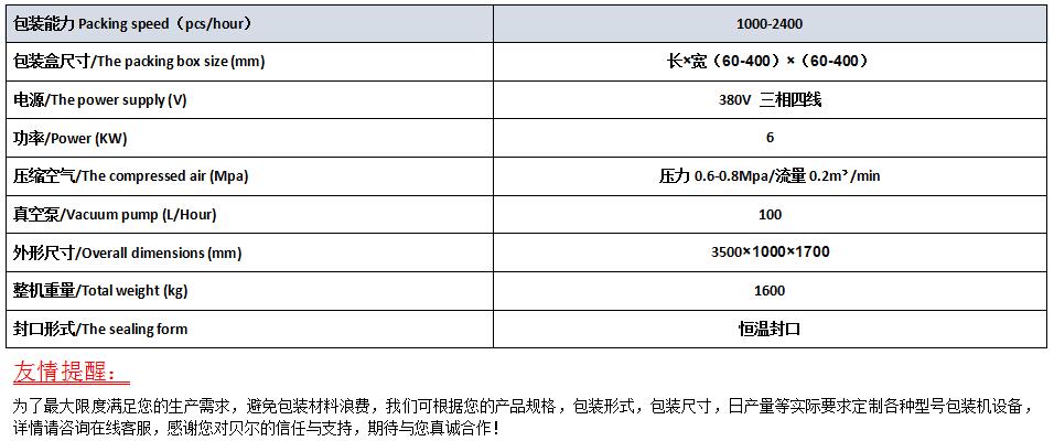 真空充氣包裝機是我廠2002年開發的產品,經過十六年的研發與完善,,該機能夠自動落盒,將塑料盒準確落入模具中,自動打印生產日期及批號,自動抽真空后充入N2、02、CO2單一氣體或混合氣體。貝爾盒式包裝機以其成熟技術,高端原裝進口主機配件,高效使用性能。